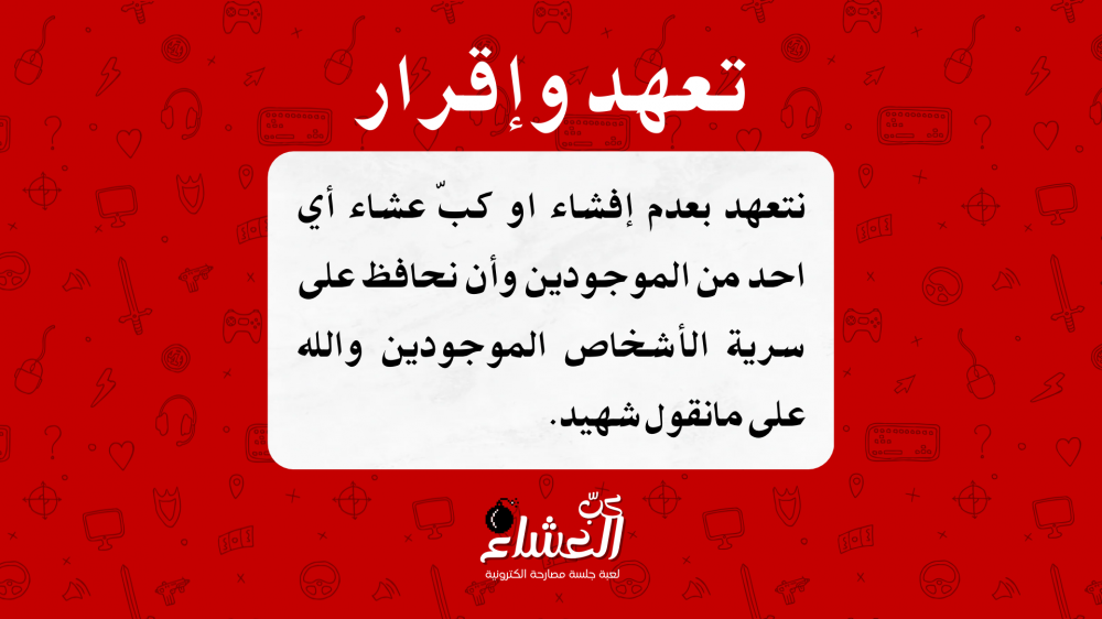 نتعهد بعدم إفشاء او كبّ عشاء أي احد من الموجودين وأن نحافظ على سرية الأشخاص الموجودين والله على مانقول شهيد.